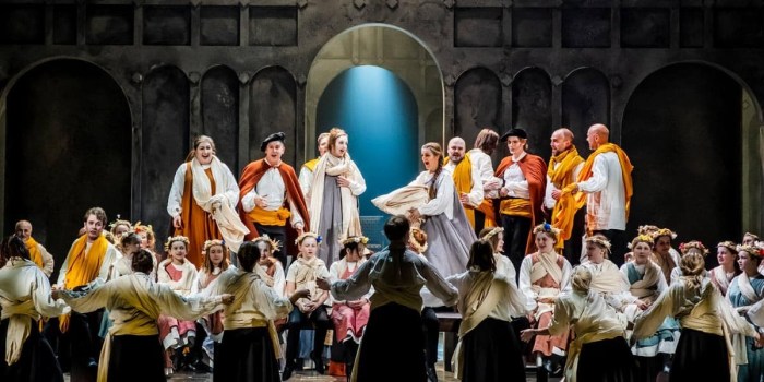 Hela första akten är mörk och tung. Här finns för många personer att hålla reda på samt en för komplex text. Den svaga ljussättningen gör att man har svårt att hålla huvudet uppe och bli riktigt engagerad. Därtill sångare som knappt hörs över rampen.