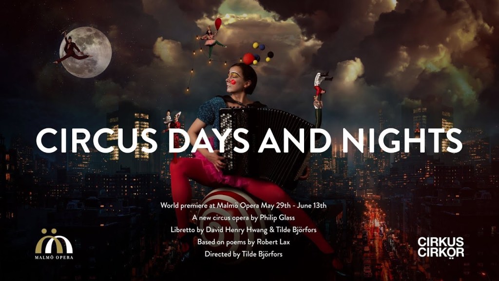 Foto Mats Bäcker, Cirkusopera av Philip Glass. Libretto: David Henry Hwang och Tilde Björfors. Baserad på dikter av Robert Lax. Regi och koncept: Tilde Björfors. Kapellmästare: Minna Weurlander. Scenografi och kostym: Magdalena Åberg. Koreografi: Methineee Wongtrakoon och Simon Wiborn. Ljus: Ellen Ruge och Robert Hvenström. Ljud: Avgoustos Psillas. Riggdesign: Saar Rombout. I rollerna: Elin Rambo, Jakob Högström, Methinee Wongtrakoon, Simon Wiborn, Karolina Blixt, Nikolas Pulka, Aaron Hakala. Musiker: Minna Weurlander, Viktor Nordliden, Inga Zeppezauer, Blagoj Lamnjov, Oscar Fransson, Martin Jönsson, Sigvald Fersum, Malmö operakör.