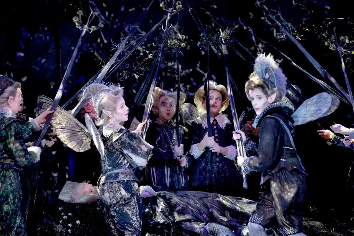Personerna som agerar träd och buskar gör det fantasifyllt och kreativt. Älvorna spelas av barn från Trinity Boys Choir, och deras insats har en betydande inverkan på föreställningens övergripande kvalitet. Då föreställningen är på engelska behövs verkligen en professionell barnkör, tillsammans med Malmö Operas barnkör får de ett fint samspel som förhöjer den känsla av mystik som föreställningen strävar efter. Här vill jag framhålla Frederick Balcombe, som Puck. Ett verkligt sagoväsen, han svävar fram i skogen i en upphängd gunga, vilket skapar en visuell finess.