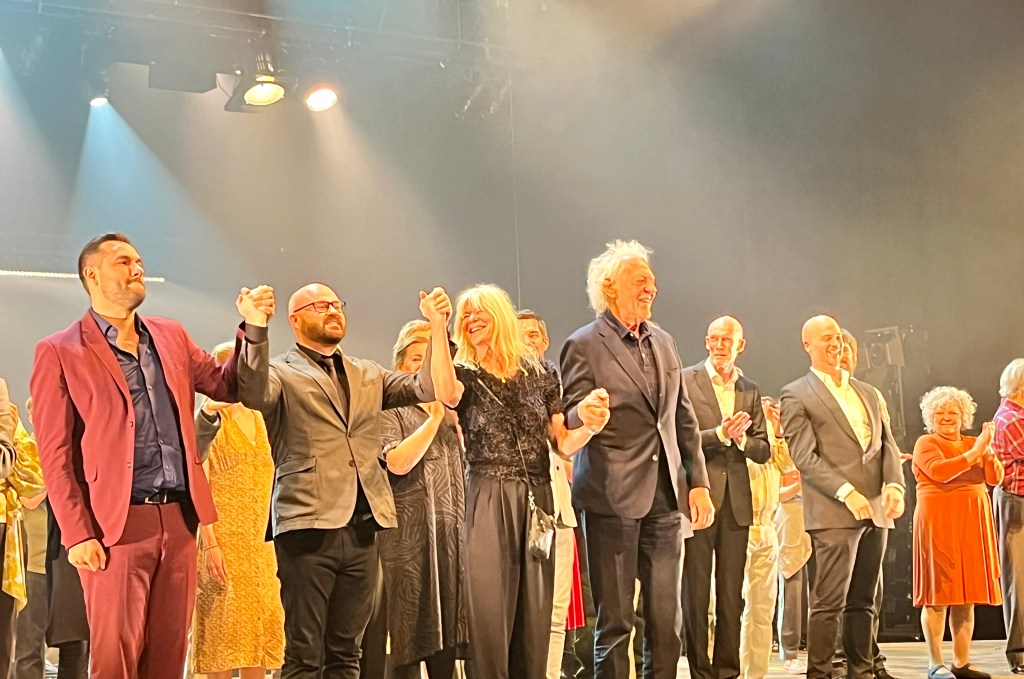 Carin och Kay Pollak i mitten är rusiga av glädje av det överväldigande applådtacket.