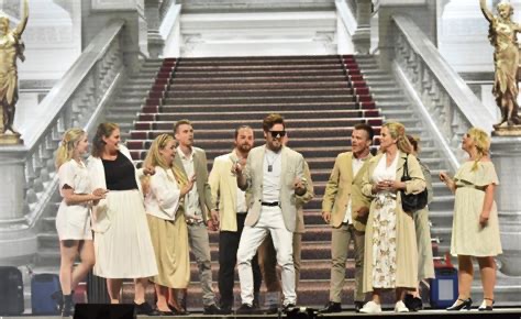 Johan Hwatz omgiven av ensemblen i sin entré