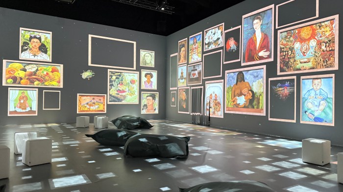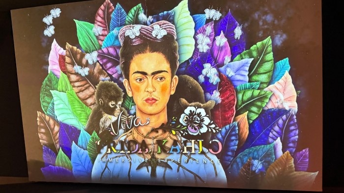 Hela Amiralen har blivit till ett gigantiskt fyrverkeri av målningar som omger oss vart vi går. Dessa projicerade verk föregås av texter om Frida Kahlos liv och leverne.