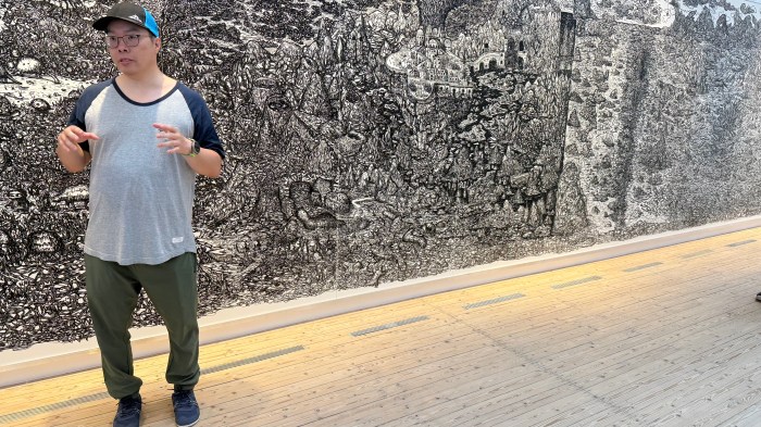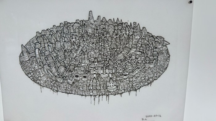 David Cheungs enorma blyertsteckning är ett dagsarbete att gå igenom. Detta sagt i positiv bemärkelse, då det inspirerar till en grundlig och noggrann betraktelse. Det är spännande att se vad han har tecknat. Han är från Malmö och har tecknat in en del kända Malmöplatser. Detta gör verket särskilt intressant för lokalbefolkningen. Känslan av nostalgi och tillhörighet är påtaglig. Det är nästan som att promenera genom staden med ett konstverk som kartlägger vägarna.