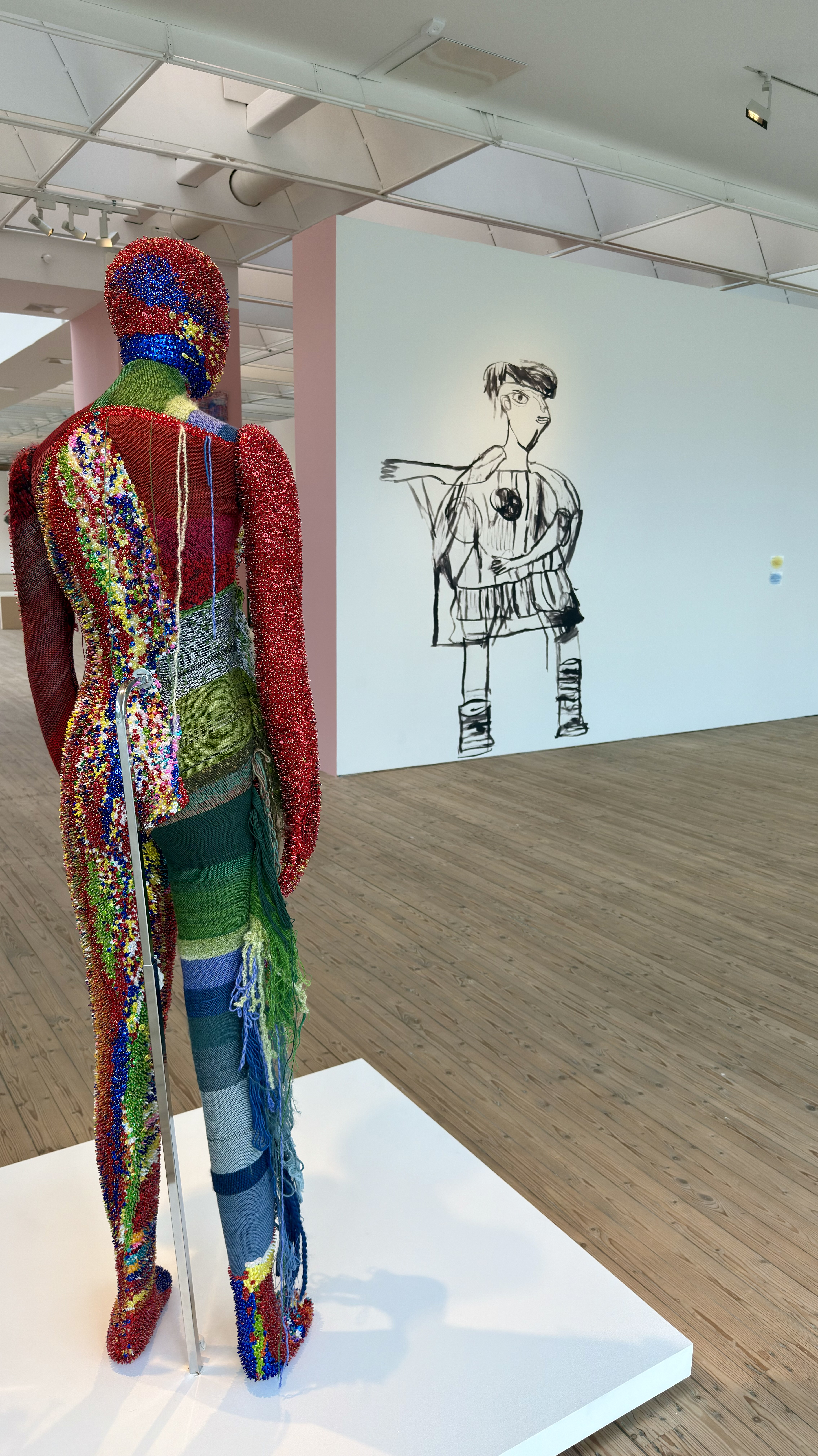 Jag blev förtjust i Monica Valentines rödskimrande figur som tar sin självklara plats i konsthallen. Dockan är av pärlor och paljetter, vilket ger den en glittrande och nästan magisk känsla. Jag kunde inte låta bli att bli fascinerad. Varje liten detalj i dockan verkar förmedla en berättelse och emotionell resonans.